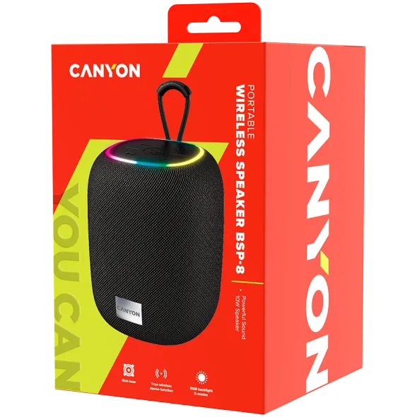 Der neue tragbare kabellose Lautsprecher von Canyon ist bereit, Ihre absoluten Favoriten abzuspielen. Mit einer Leistung von 10 Watt ist er ein Kraftpaket im Reiseformat. Abgerundete Formen, kompakte Größe und ein praktischer kleiner Griff machen ihn zum perfekten Begleiter für eine Reise oder eine Landpartie mit Ihren Freunden! Die RGB-Hintergrundbeleuchtung oben sieht nach Einbruch der Dunkelheit großartig aus, und dort finden Sie leicht die Wiedergabesteuertasten. Verbinden Sie zwei Lautsprecher im TWS-Modus, um einen vollen Stereo-Effekt zu erzeugen und überall eine unvergessliche Party zu haben! Genießen Sie bis zu 3 Stunden Musik über Bluetooth und schließen Sie das Gerät an, sobald der Akku leer ist - einfach mit jedem Typ-C-Kabel. Außerdem können Sie AUX, USB oder eine MicroSD-Speicherkarte als Medienquelle verwenden. Wir empfehlen wirklich die Verwendung von Bluetooth – was gibt es Besseres, als Playlists spontan zu wechseln? Bis zu 10 Meter vom Lautsprecher entfernt bleibt die Verbindung stabil. Holen Sie sich Ihren BSP-8 Lautsprecher in Rot, Grau oder Schwarz – Ihre Abenteuer brauchen einen Soundtrack.